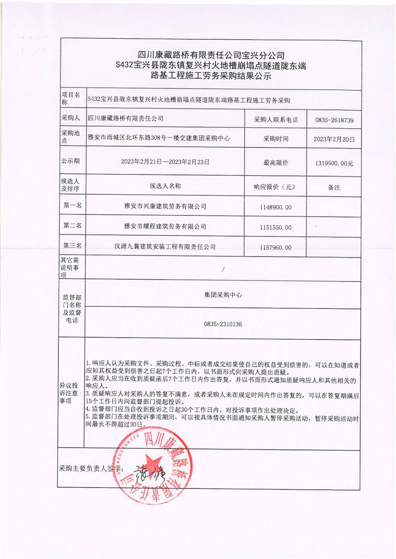 四川康藏路橋有限責(zé)任公司寶興分公司S432寶興縣隴東鎮(zhèn)復(fù)興村火地槽崩塌點(diǎn)隧道隴東端路基工程施工勞務(wù)采購(gòu)結(jié)果公示