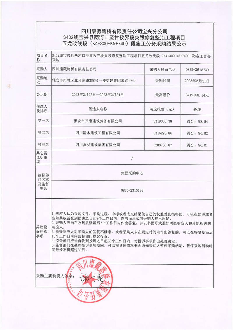 四川康藏路橋有限責(zé)任公司寶興分公司S432寶興縣兩河口至甘孜界段災(zāi)毀修復(fù)整治工程項(xiàng)目五龍改線段(K4+300-K5+740)段施工勞務(wù)采購(gòu)結(jié)果公示