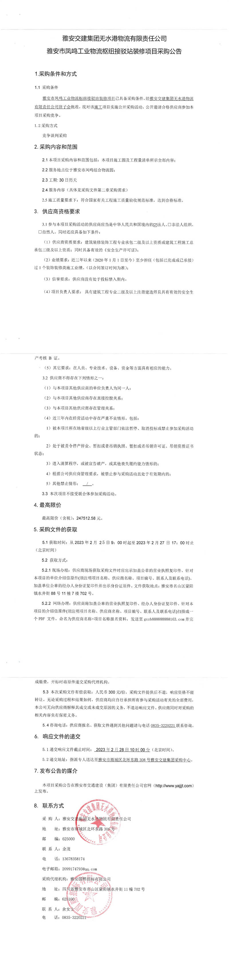 雅安交建集團(tuán)無(wú)水港物流有限責(zé)任公司雅安市鳳鳴工業(yè)物流樞紐接駁站裝修項(xiàng)目采購(gòu)公告