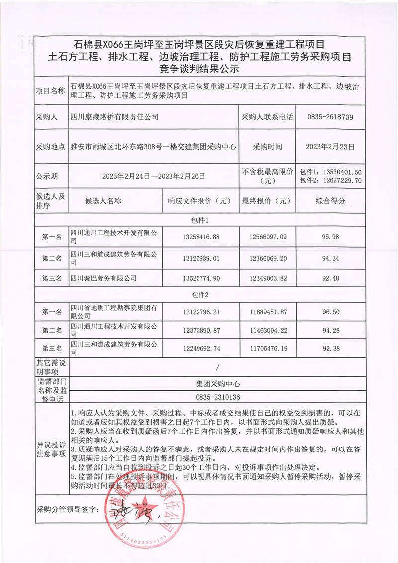 四川康藏路橋有限責(zé)任公司石棉縣X066王崗坪至王崗坪景區(qū)段災(zāi)后恢復(fù)重建工程項目土石方工程、排水工程、邊坡治理工程、防護工程施工勞務(wù)采購項目競爭談判結(jié)果公示