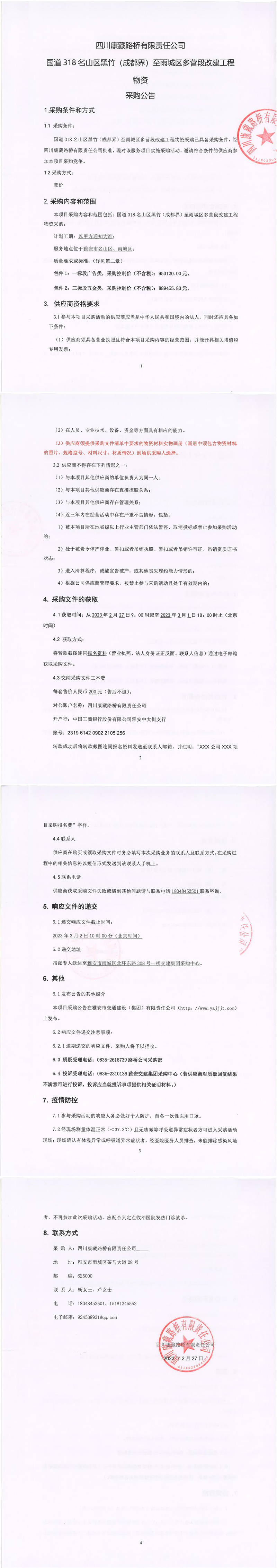 四川康藏路橋有限責(zé)任公司國道318名山區(qū)黑竹(成都界)至雨城區(qū)多營段改建工程物資采購公告
