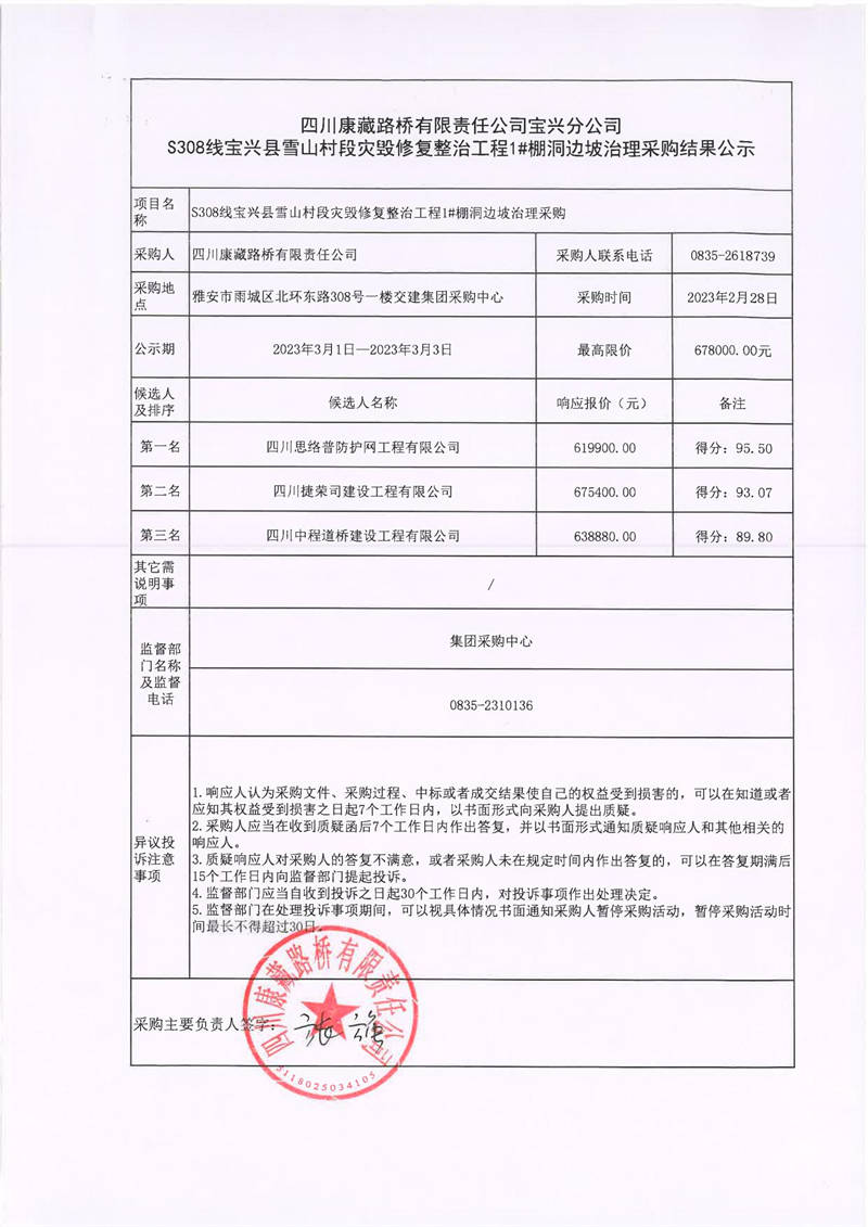 四川康藏路橋有限責(zé)任公司寶興分公司S308線寶興縣雪山村段災(zāi)毀修復(fù)整治工程1#棚洞邊坡治理采購結(jié)果公示