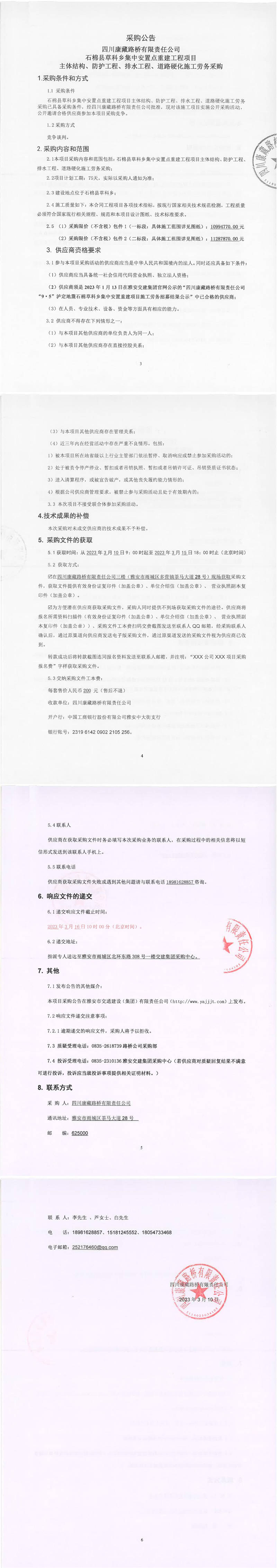 四川康藏路橋有限責(zé)任公司石棉縣草科鄉(xiāng)集中安置點(diǎn)重建工程項(xiàng)目主體結(jié)構(gòu)、防護(hù)工程、排水工程、道路硬化施工采購公告