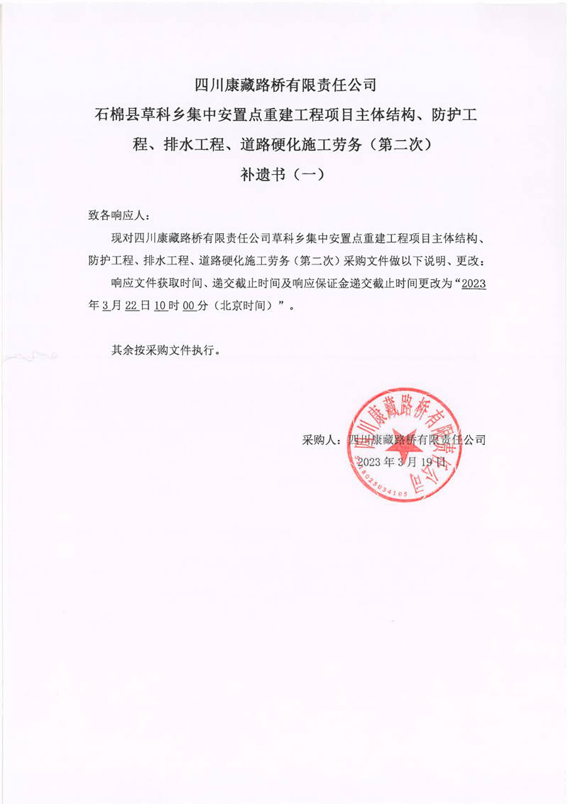 四川康藏路橋有限責任公司石棉縣草科鄉(xiāng)集中安置點重建工程項目主體結(jié)構(gòu)、防護工程、排水工程、道路硬化施工勞務(第二次)補遺書(一)