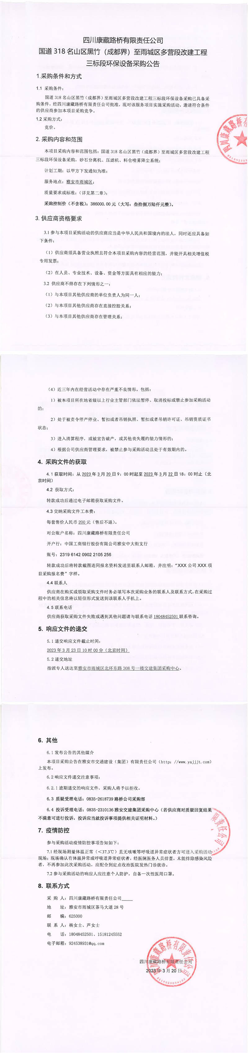 四川康藏路橋有限責(zé)任公司國(guó)道318名山區(qū)黑竹(成都界)至雨城區(qū)多營(yíng)段改建工程三標(biāo)段環(huán)保設(shè)備采購公告