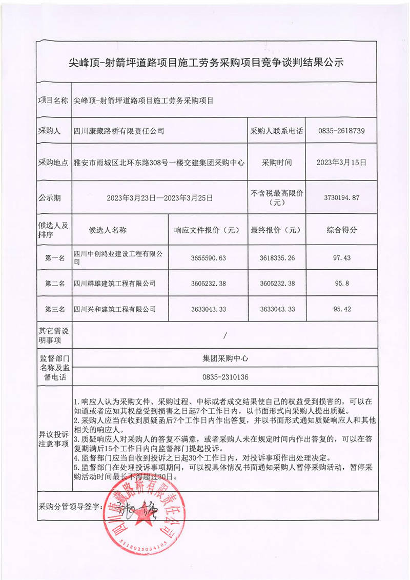 四川康藏路橋有限責任公司尖峰頂-射箭坪道路項目施工勞務采購項目競爭談判結(jié)果公示