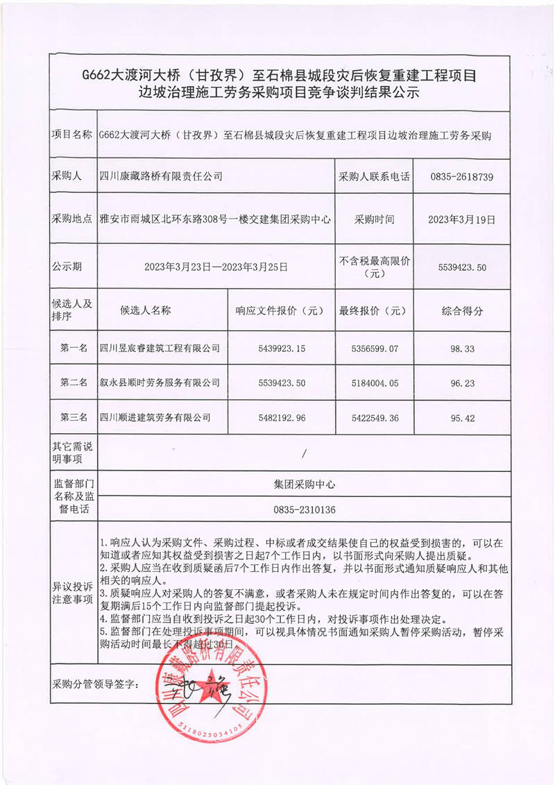 四川康藏路橋有限責任公司G662大渡河大橋(甘孜界)至石棉縣城段災后恢復重建工程項目邊坡治理施工勞務采購項目競爭談判結(jié)果公示