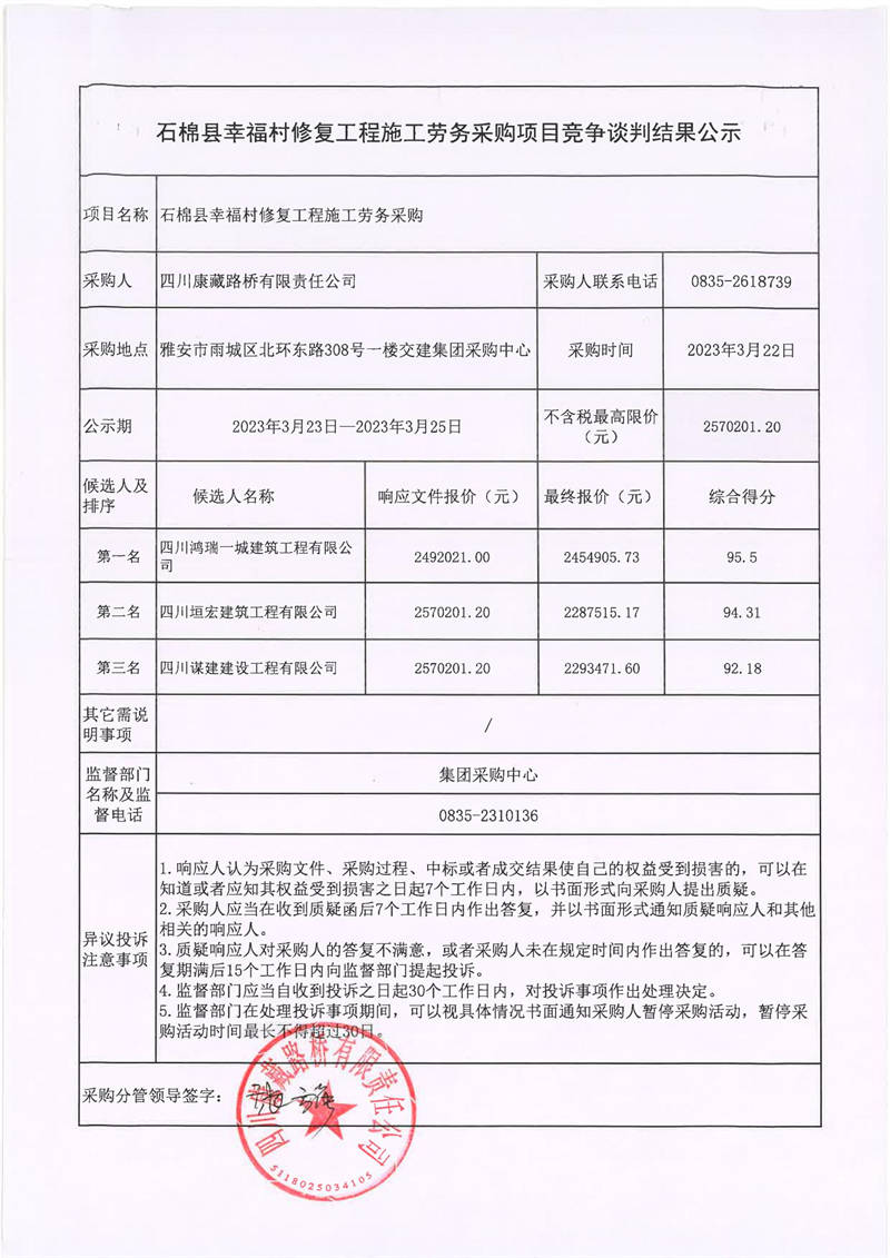 四川康藏路橋有限責任公司石棉縣幸福村修復工程施工勞務采購項目競爭談判結(jié)果公示
