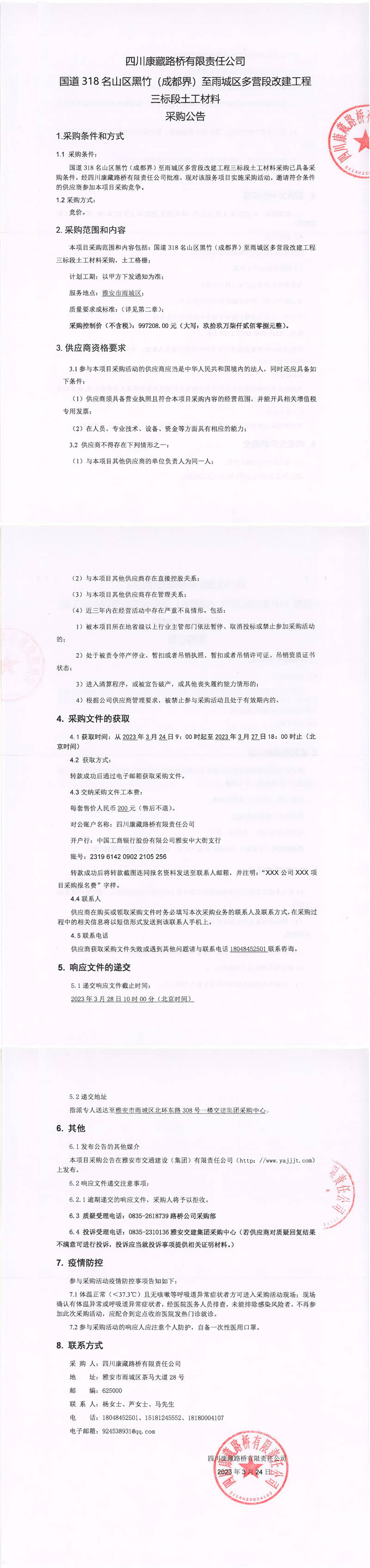 四川康藏路橋有限責任公司國道318名山區(qū)黑竹(成都界)至雨城區(qū)多營段改建工程三標段土工材料采購公告