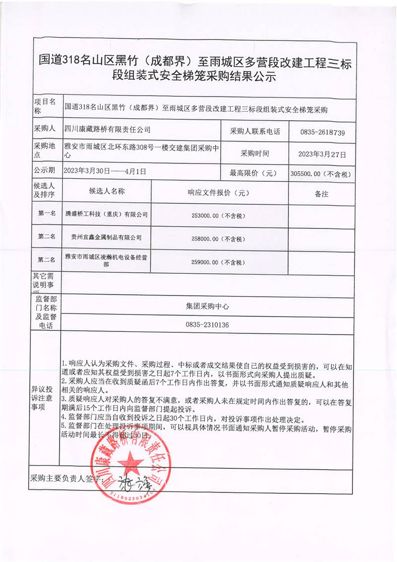 四川康藏路橋有限責(zé)任公司國(guó)道318名山區(qū)黑竹(成都界)至雨城區(qū)多營(yíng)段改建工程三標(biāo)段組裝式安全梯籠采購(gòu)結(jié)果公示