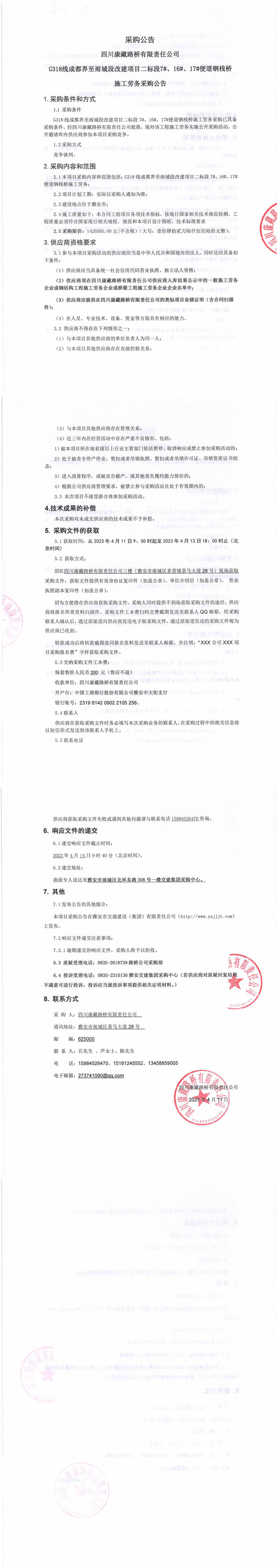 四川康藏路橋有限責(zé)任公司G318線(xiàn)成都界至雨城段改建項(xiàng)目二標(biāo)段7#、16#、17#便道鋼棧橋施工勞務(wù)采購(gòu)公告