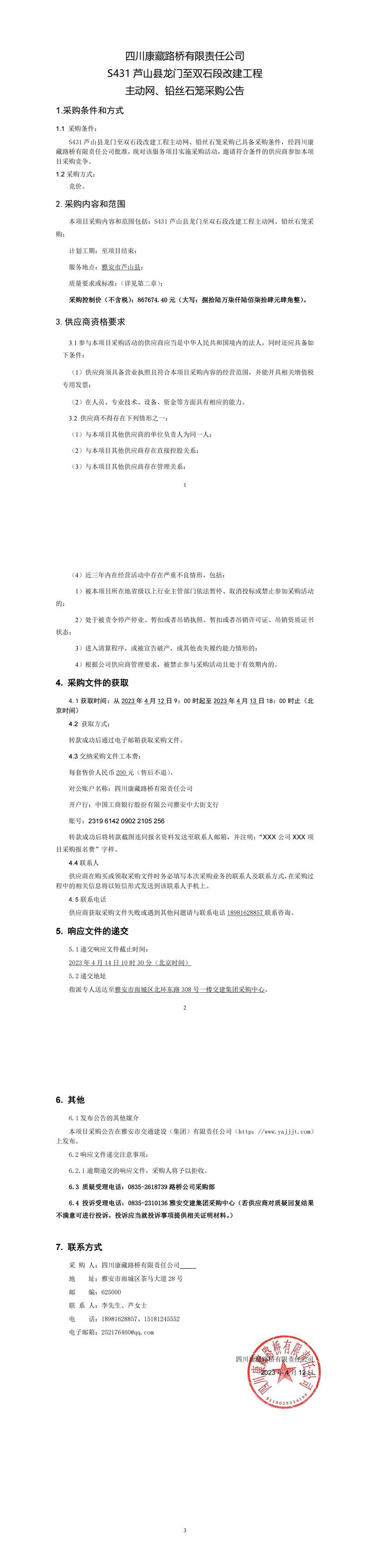 四川康藏路橋有限責(zé)任公司S431蘆山縣龍門(mén)至雙石段改建工程主動(dòng)網(wǎng)、鉛絲籠采購(gòu)公告