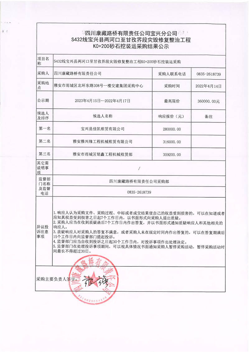 四川康藏路橋有限責(zé)任公司寶興分公司S432線寶興縣兩河口至甘孜界段災(zāi)毀修復(fù)整治工程K0+200砂石挖裝運(yùn)采購(gòu)結(jié)果公示