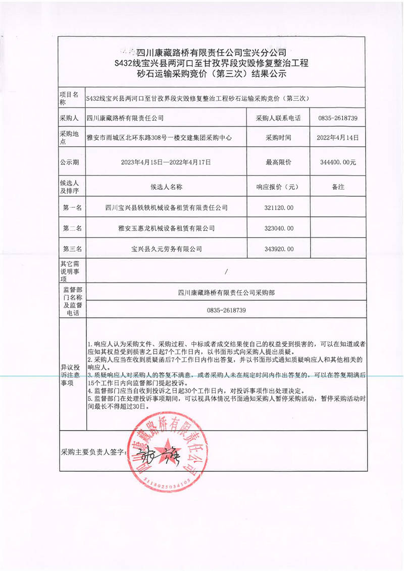 四川康藏路橋有限責(zé)任公司寶興分公司S432線寶興縣兩河口至甘孜界段災(zāi)毀修復(fù)整治工程砂石運(yùn)輸采購競價(jià)(第三次)結(jié)果公示