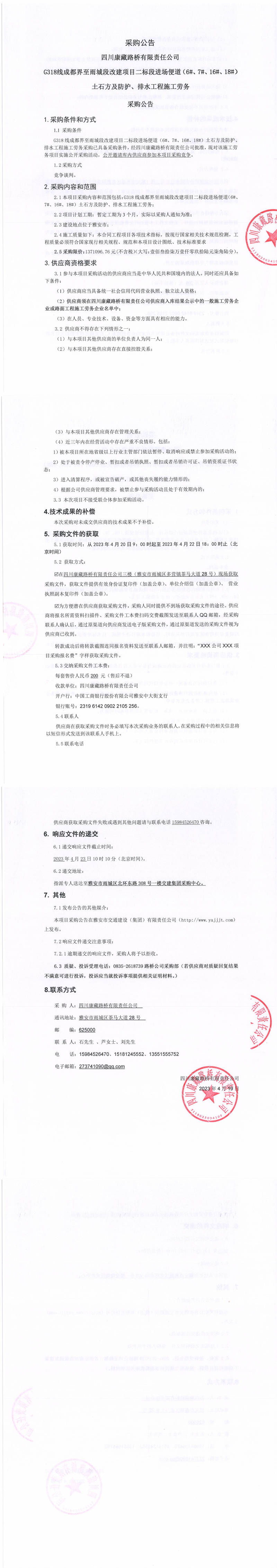 四川康藏路橋有限責(zé)任公司G318線成都至雨城段改建項(xiàng)目二標(biāo)段進(jìn)場便道(6#、7#、16#、18#)土石方及防護(hù)、排水工程施工勞務(wù)