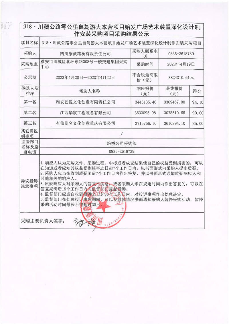 四川康藏路橋有限責任公司318·川藏公路零公里自駕游大本營項目始發(fā)廣場藝術(shù)裝置深化設計制作安裝采購項目采購結(jié)果公示