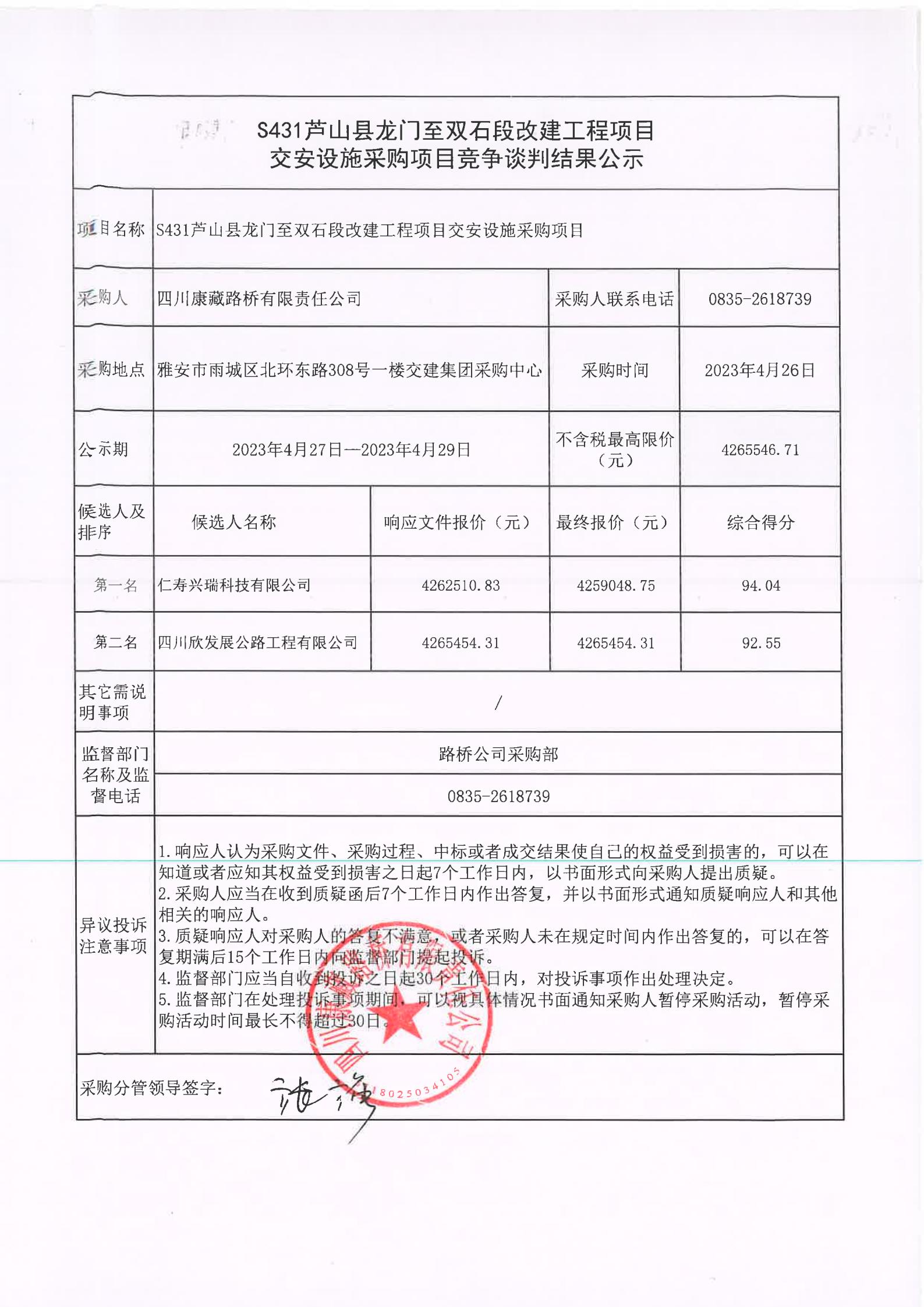 四川康藏路橋有限責(zé)任公司S431蘆山縣龍門至雙石段改建工程項目交安設(shè)施采購項目競爭談判結(jié)果公示