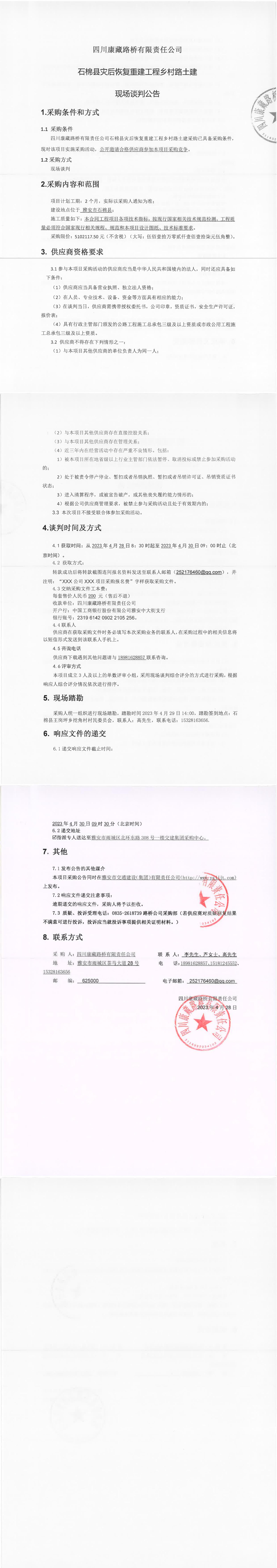 四川康藏路橋有限責(zé)任公司石棉縣災(zāi)后恢復(fù)重建工程鄉(xiāng)村路土建現(xiàn)場談判公告