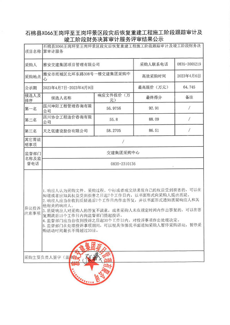 雅安交建集團(tuán)項(xiàng)目管理有限公司石棉縣X066王崗坪至王崗坪景區(qū)段災(zāi)后恢復(fù)重建工程施工階段跟蹤審計及竣工階段財務(wù)決算審計服務(wù)評審結(jié)果公示