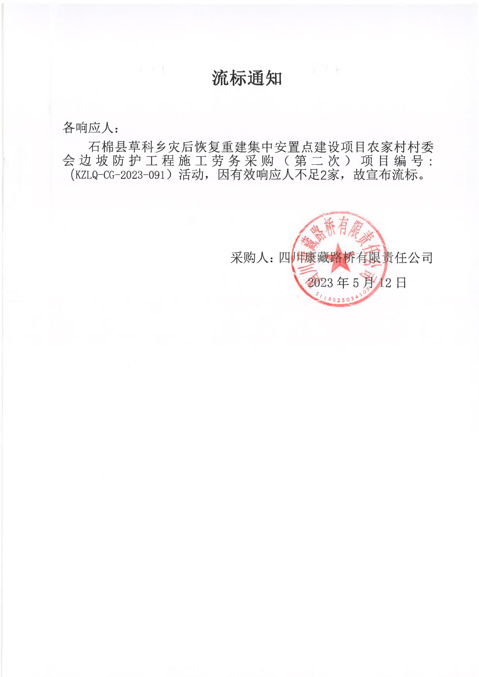 四川康藏路橋有限責(zé)任公司石棉草科鄉(xiāng)集中安置點建設(shè)項目農(nóng)家村村委會邊坡防護(hù)工程施工勞務(wù)采購(第二次)流標(biāo)通知