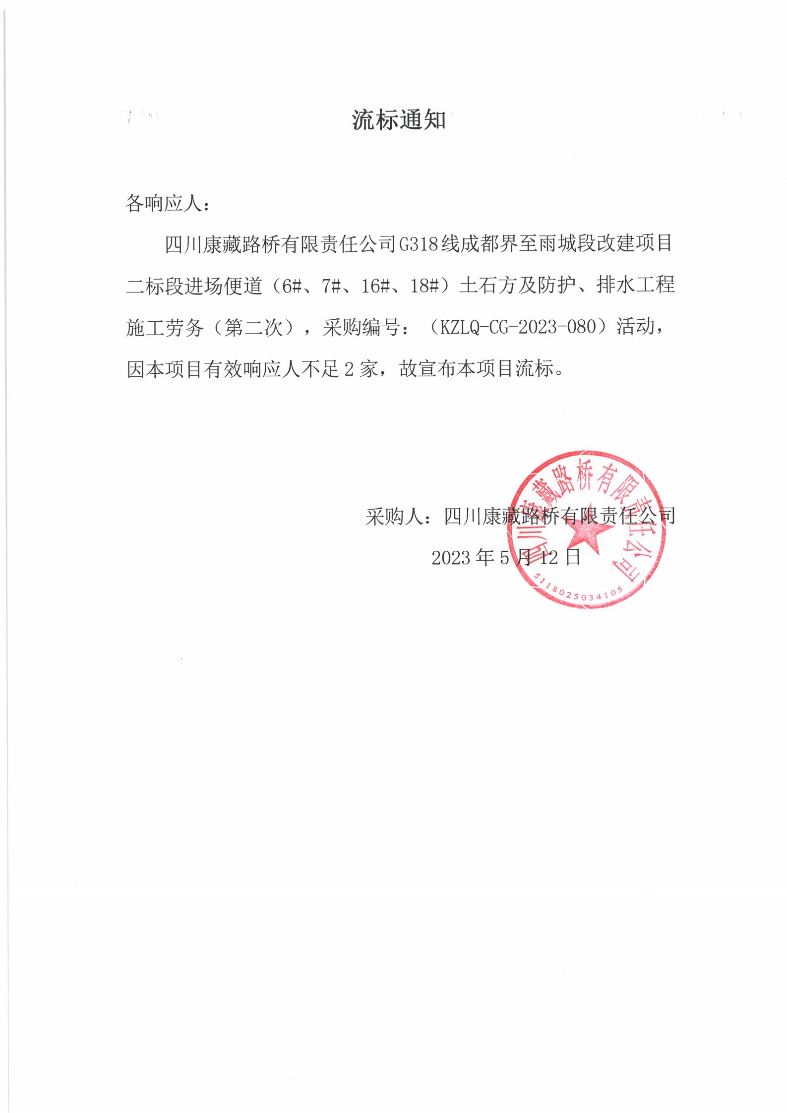 四川康藏路橋有限責(zé)任公司G318線成都至雨城段改建項(xiàng)目二標(biāo)段進(jìn)場(chǎng)便道(6#、7#、16#、18#)土石方及防護(hù)、排水工程施工勞務(wù)(第二次)流標(biāo)通知