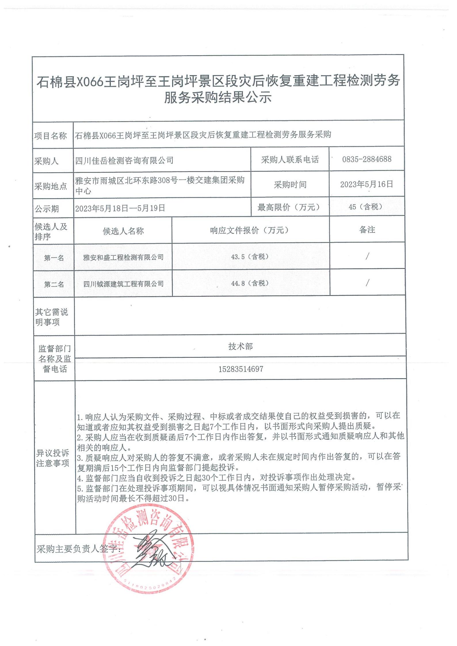 四川佳岳檢測(cè)咨詢有限公司石棉縣X066王崗坪至王崗坪景區(qū)段災(zāi)后恢復(fù)重建工程檢測(cè)勞務(wù)服務(wù)采購(gòu)結(jié)果公示