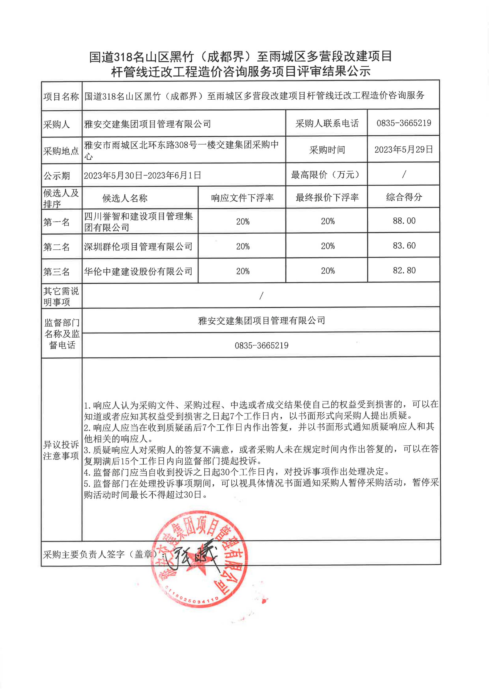 雅安交建集團(tuán)項(xiàng)目管理有限公司國(guó)道318名山區(qū)黑竹(成都界)至雨城區(qū)多營(yíng)段改建項(xiàng)目桿管線遷改工程造價(jià)咨詢(xún)服務(wù)項(xiàng)目評(píng)審結(jié)果公示