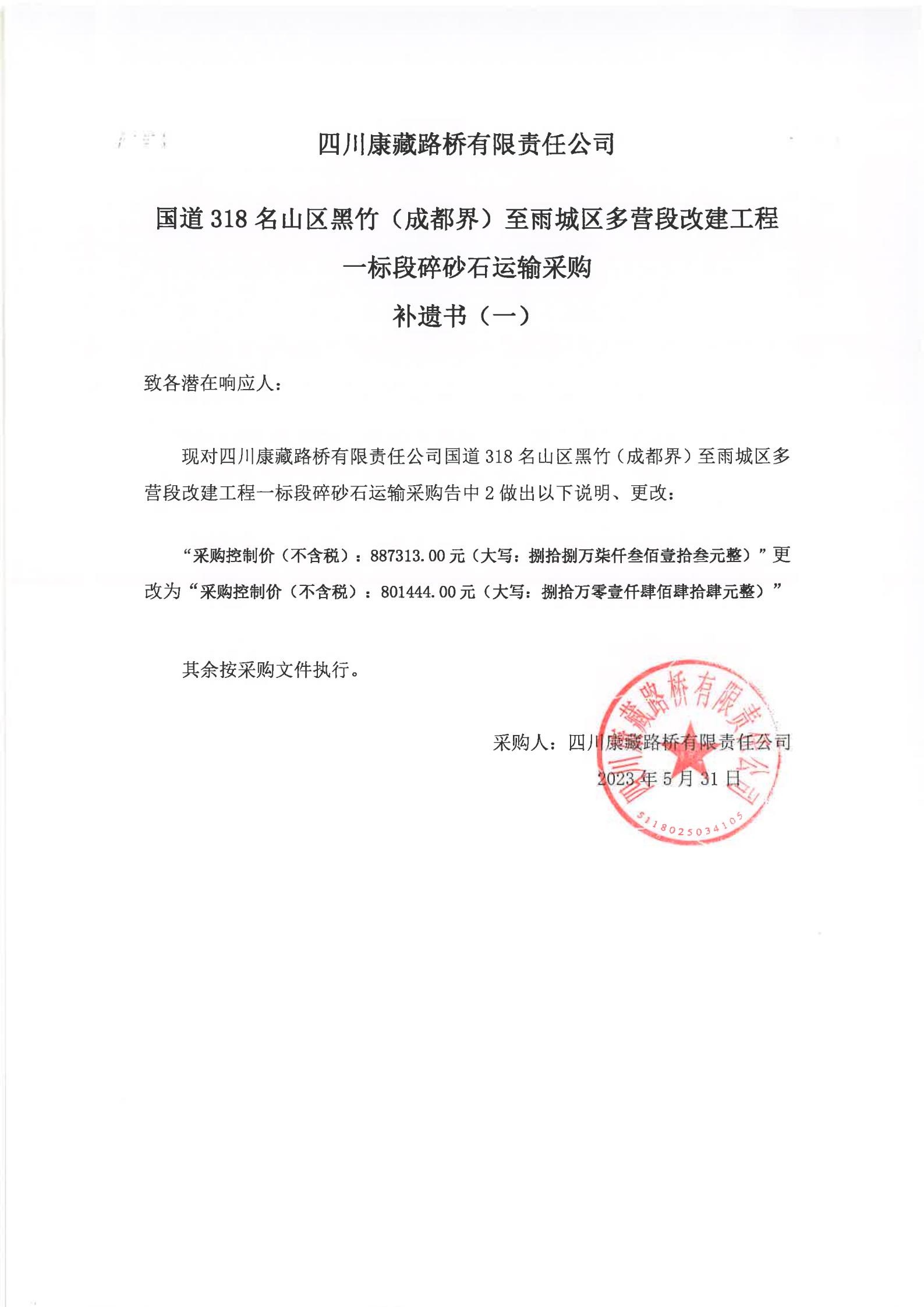 四川康藏路橋有限責(zé)任公司國(guó)道318名山區(qū)黑竹(成都界)至雨城區(qū)多營(yíng)段改建工程一標(biāo)段碎砂石運(yùn)輸采購(gòu)補(bǔ)遺書(shū)(一)