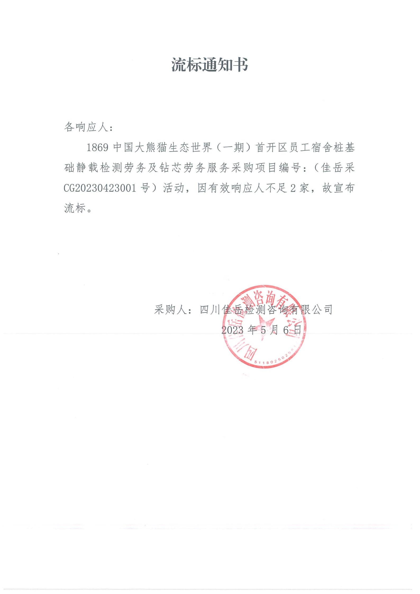四川佳岳檢測(cè)咨詢有限公司1869中國(guó)大熊貓生態(tài)世界(一期)首開區(qū)員工宿舍樁基礎(chǔ)靜載檢測(cè)勞務(wù)及磚芯庫勞務(wù)服務(wù)流標(biāo)通知
