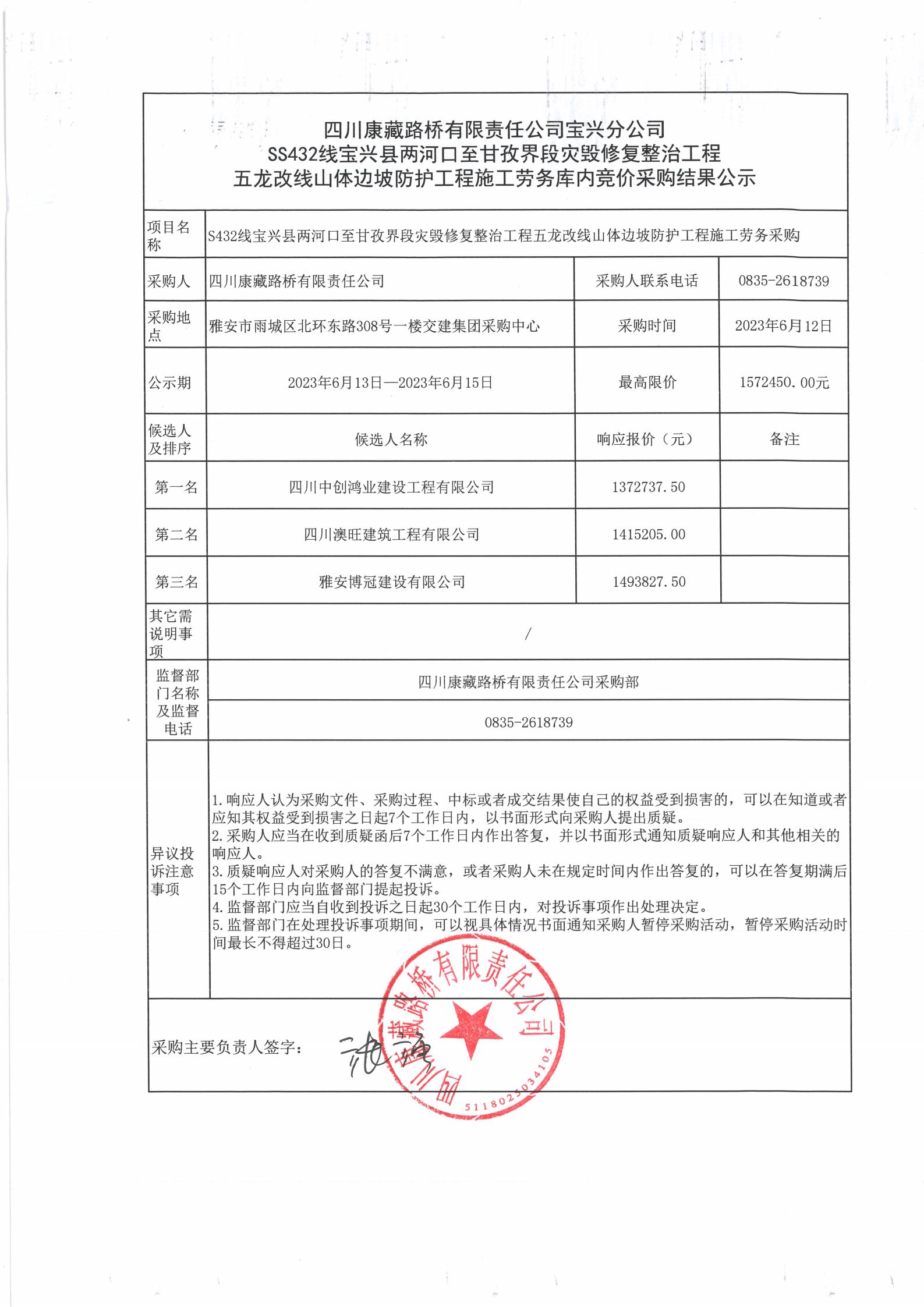 四川康藏路橋有限責任公司S432線寶興縣兩河口至甘孜界段災(zāi)毀修復(fù)整治工程五龍改線山體邊坡防護施工勞務(wù)庫內(nèi)競價采購結(jié)果公示