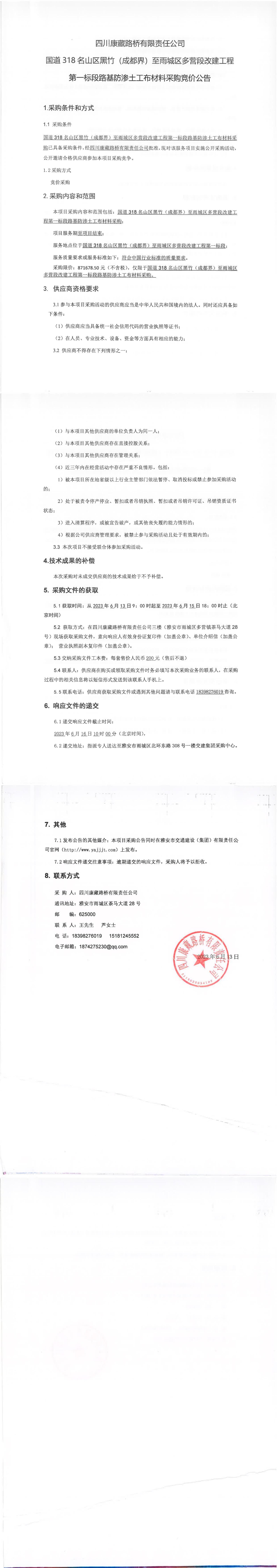 四川康藏路橋有限責(zé)任公司國道318名山區(qū)黑竹(成都界)至雨城區(qū)多營段改建工程第一標(biāo)段路基防滲土工布材料采購競價(jià)公告
