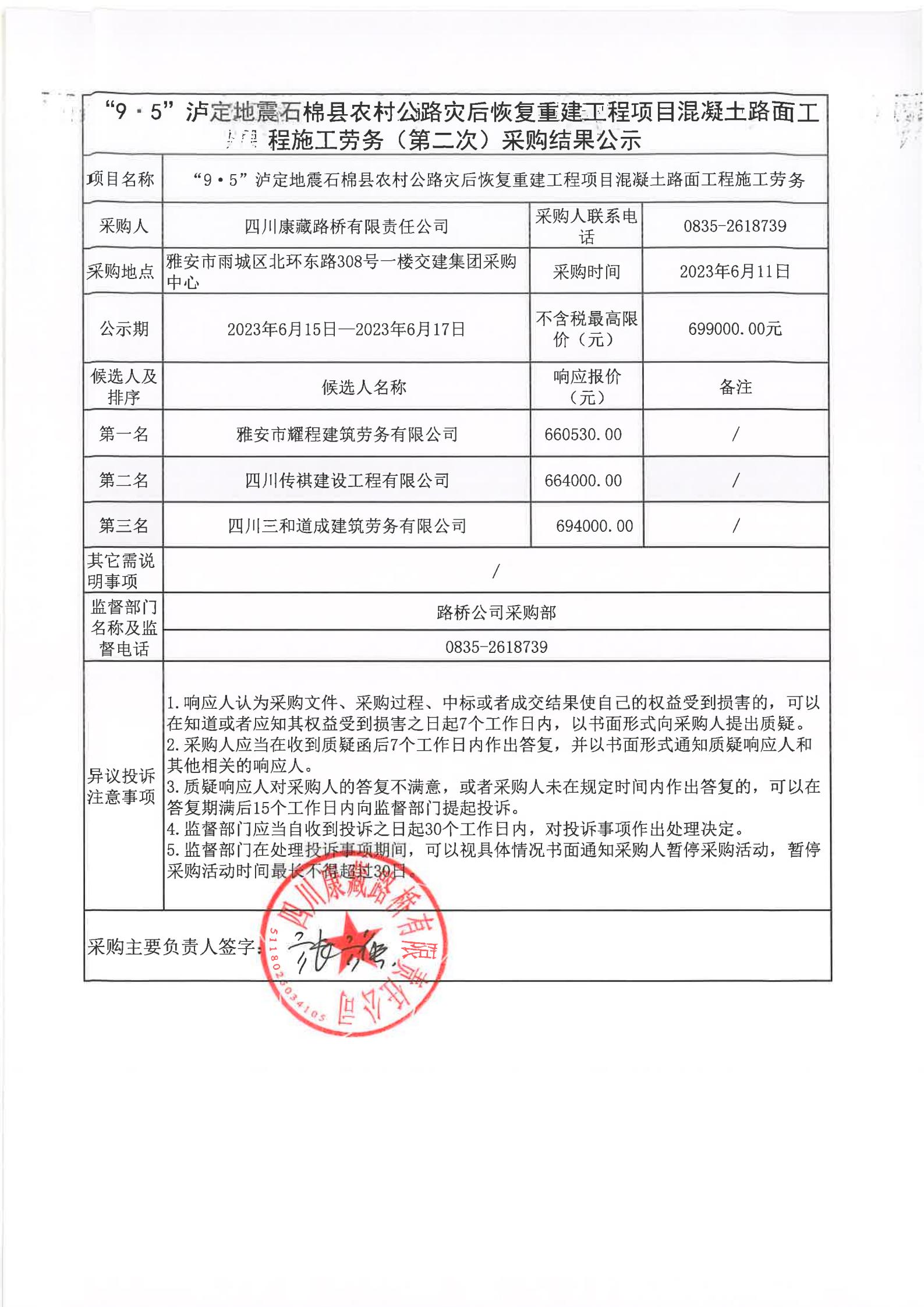 四川康藏路橋有限責(zé)任公司“9·5”瀘定地震石棉縣農(nóng)村公路災(zāi)后恢復(fù)重建工程項(xiàng)目混凝土路面工程施工勞務(wù)采購(第二次)結(jié)果公示
