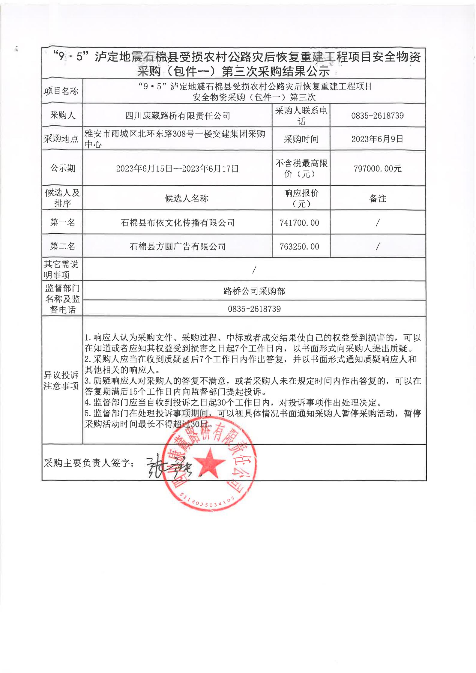 四川康藏路橋有限責(zé)任公司“9·5”瀘定地震石棉縣農(nóng)村公路災(zāi)后恢復(fù)重建工程項(xiàng)目安全物資采購(gòu)(包件一)第三次采購(gòu)結(jié)果公示