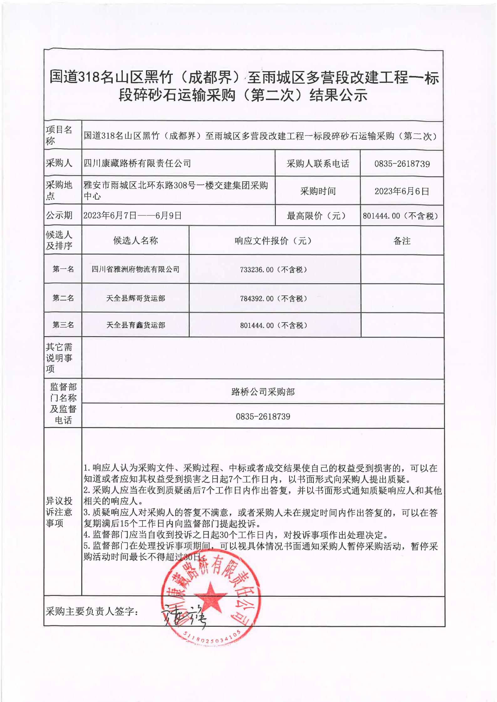 四川康藏路橋有限責(zé)任公司國(guó)道318名山區(qū)黑竹(成都界)至雨城區(qū)多營(yíng)段改建工程一標(biāo)段碎砂石運(yùn)輸采購(gòu)(第二次)結(jié)果公示
