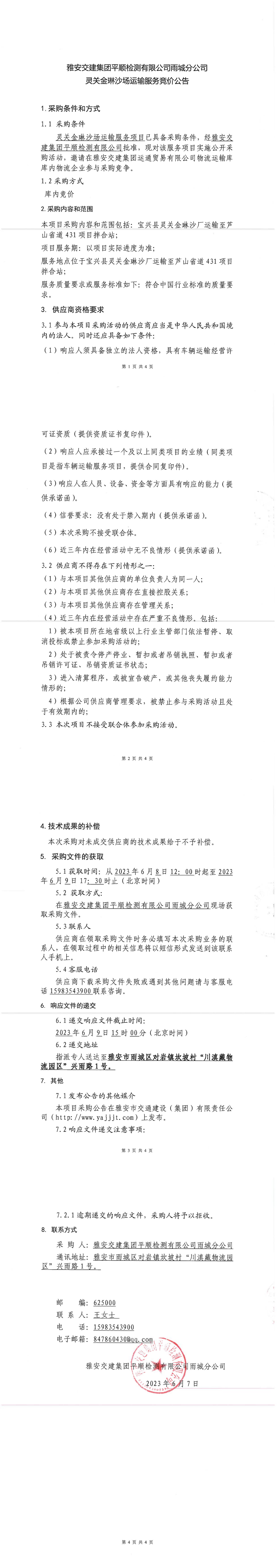 雅安交建集團平順檢測有限公司雨城分公司靈關金琳沙場運輸服務競價公告