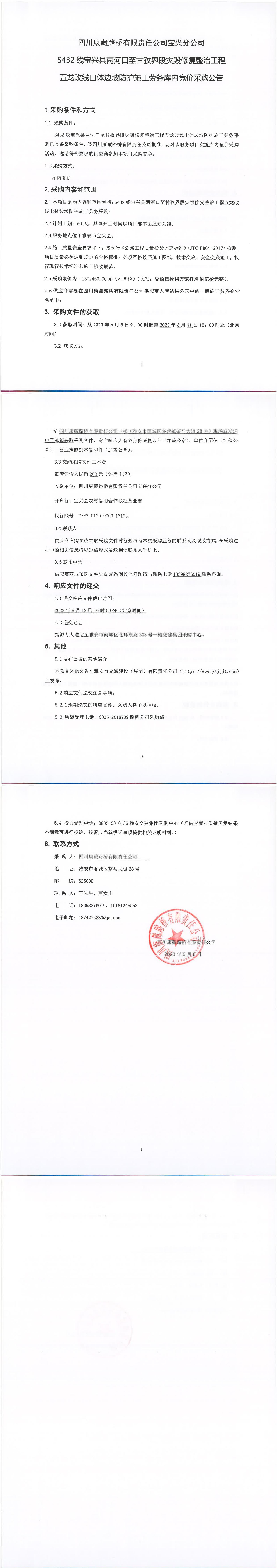 四川康藏路橋有限責(zé)任公司S432線寶興縣兩河口至甘孜界段災(zāi)毀修復(fù)整治工程五龍改線山體邊坡防護(hù)施工勞務(wù)庫內(nèi)競價(jià)采購公告