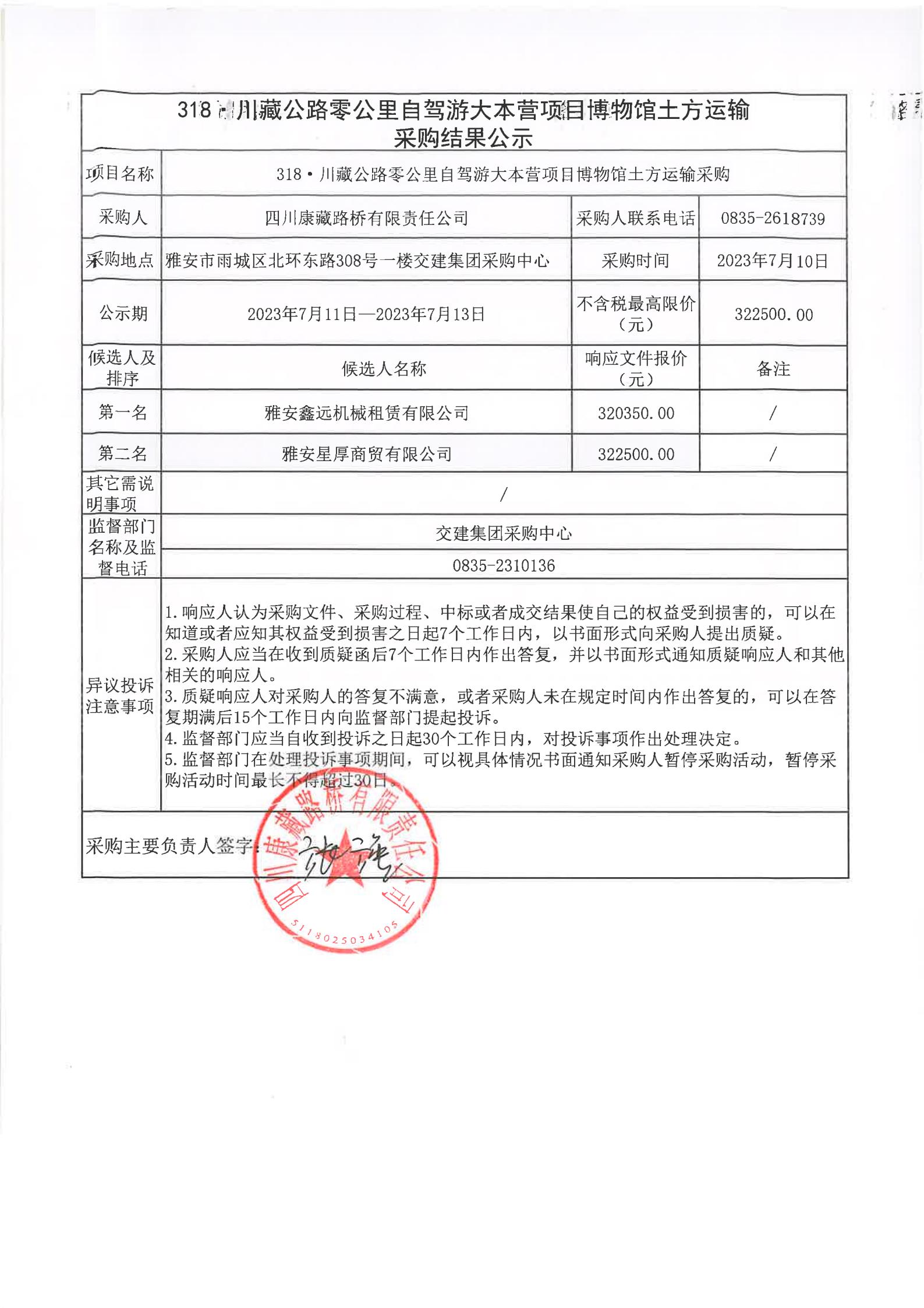 四川康藏路橋有限責任公司318·川藏公路零公里自駕游大本營項目博物館土方運輸采購結(jié)果公示