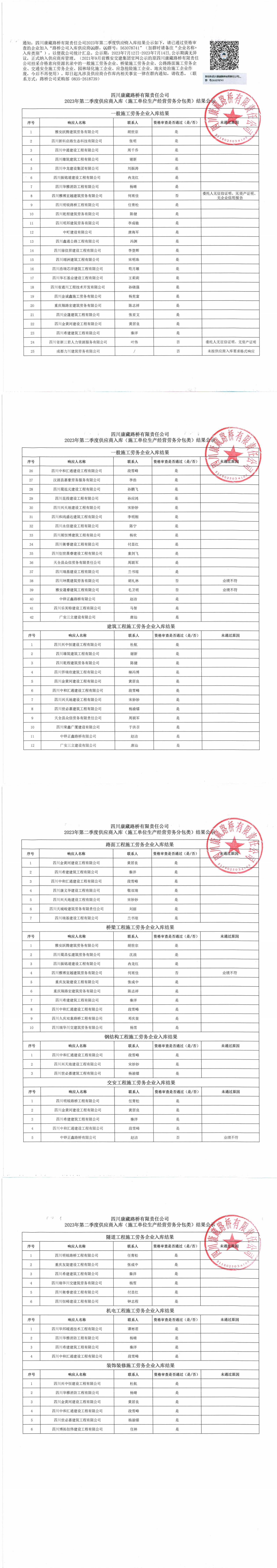 四川康藏路橋有限責任公司2023年第二季度供應商入庫(施工單位生產經營勞務分包類)結果公示