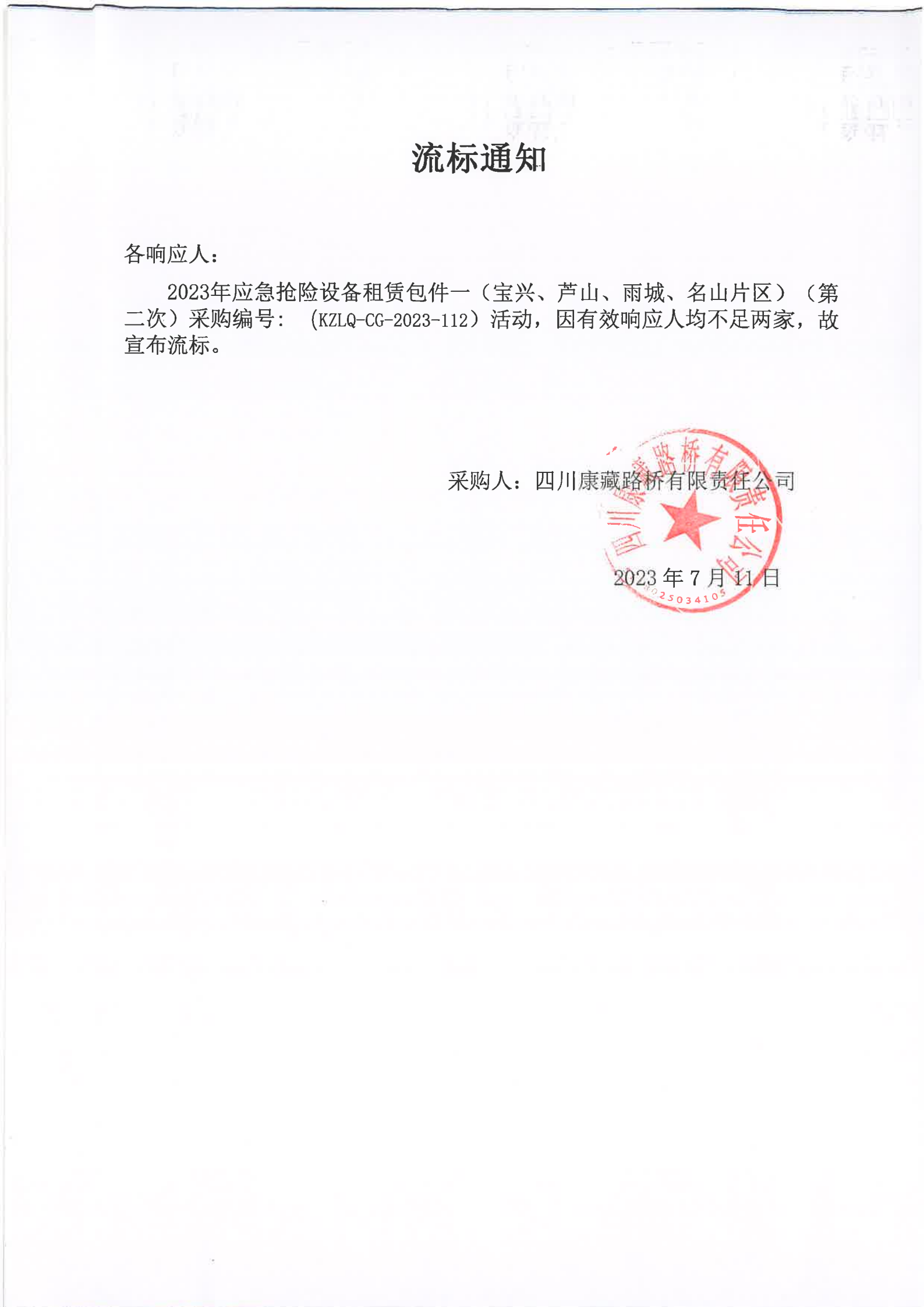 四川康藏路橋有限責(zé)任公司2023年應(yīng)急搶險設(shè)備租賃包件一(寶興、蘆山、雨城、名山片區(qū))(第二次)流標(biāo)通知