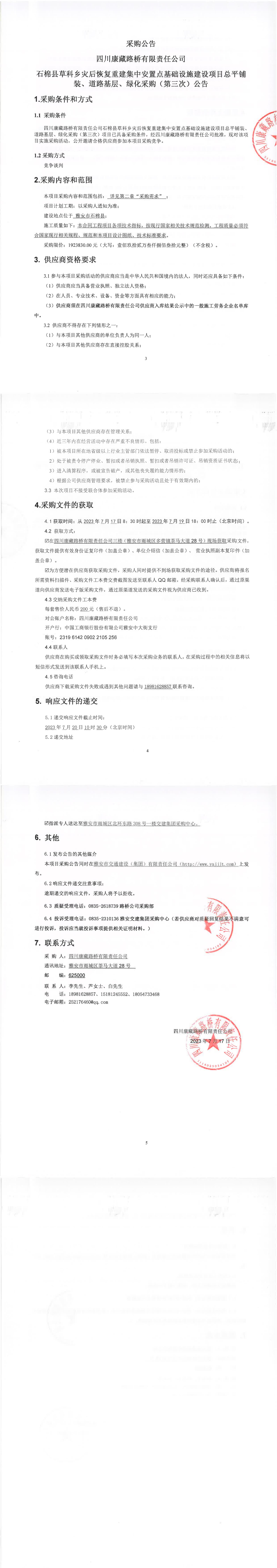 四川康藏路橋有限責任公司石棉縣草科鄉(xiāng)災后恢復重建集中安置點基礎設施建設項目總平鋪裝、道路基層、綠化采購(第三次)公告