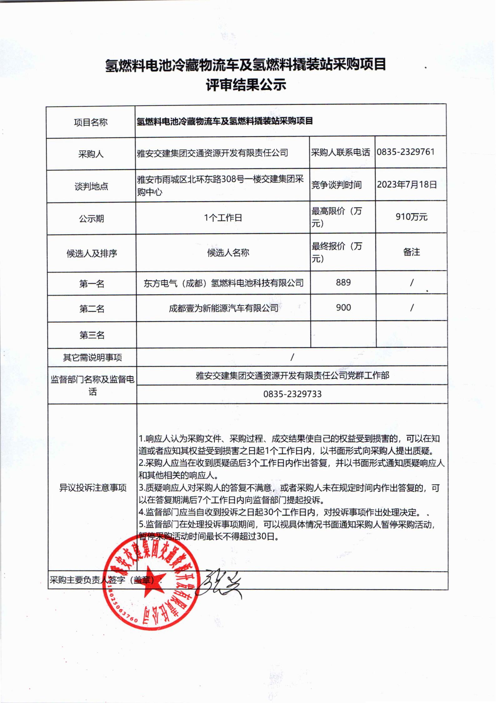 雅安交建集團交通資源開發(fā)有限責任公司氫燃料撬裝站采購項目評審結果公示