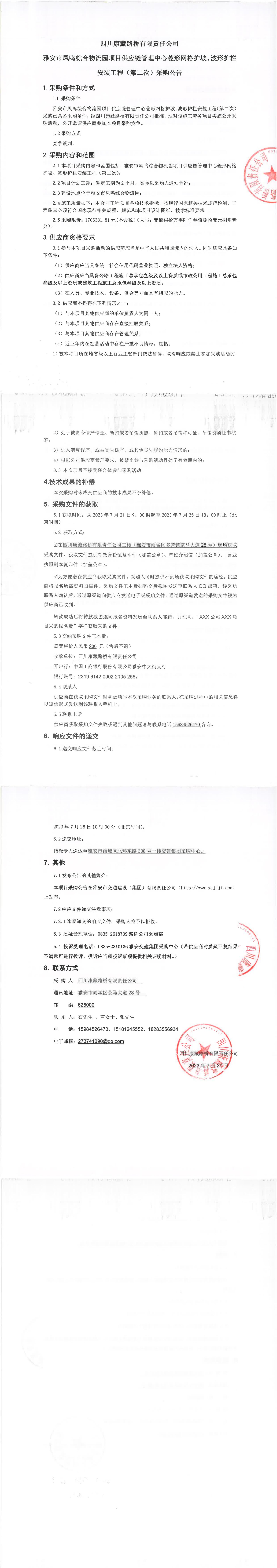 四川康藏路橋有限責任公司雅安市鳳鳴綜合物流園項目供應鏈管理中心菱形網格護坡、波形護欄安裝工程(第二次)采購公告