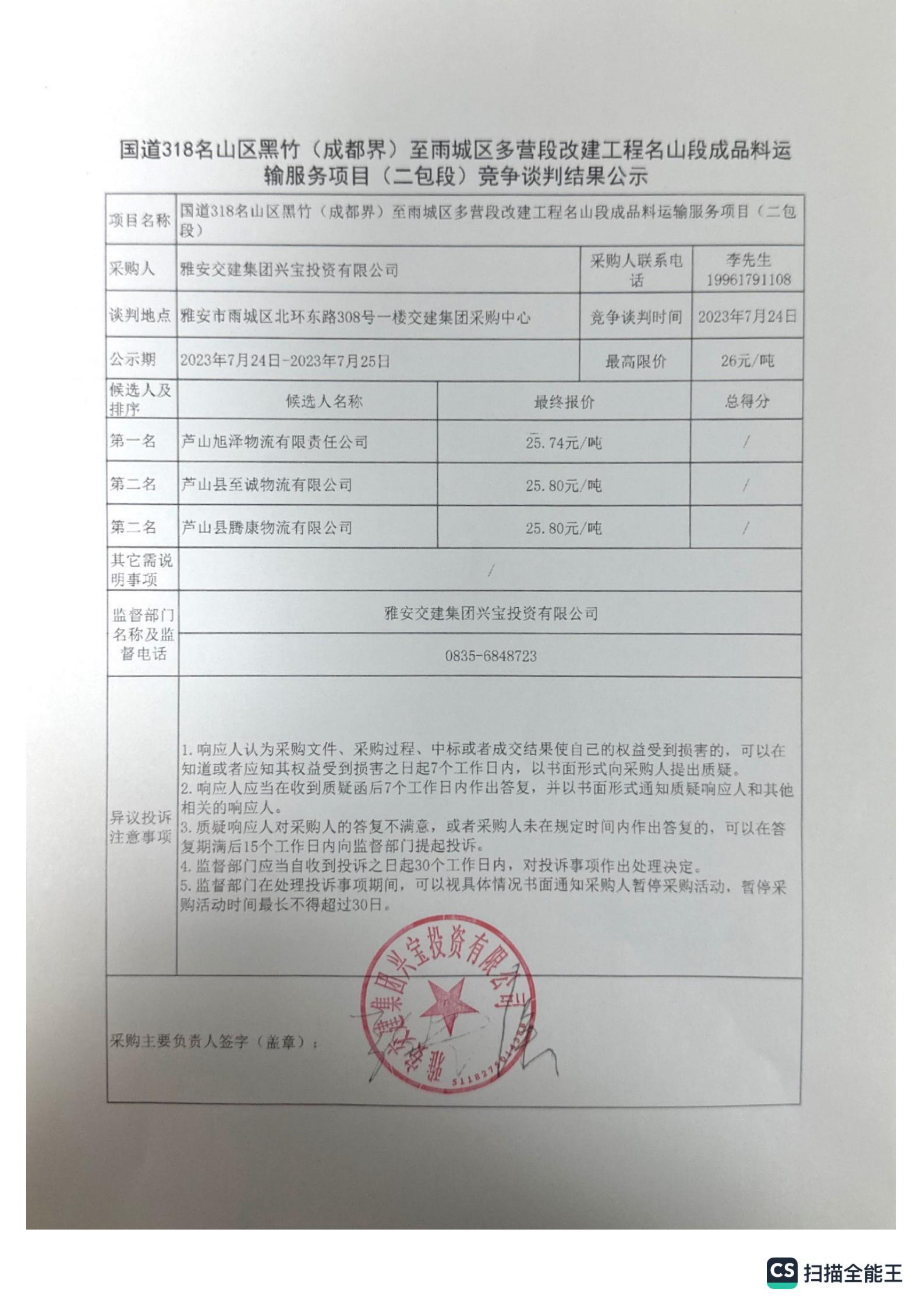 雅安交建集團(tuán)興寶投資有限公司國道318名山區(qū)黑竹(成都界)至雨城區(qū)多營段改建工程名山段成品料運(yùn)輸服務(wù)項(xiàng)目(一包段)競爭談判結(jié)果公示