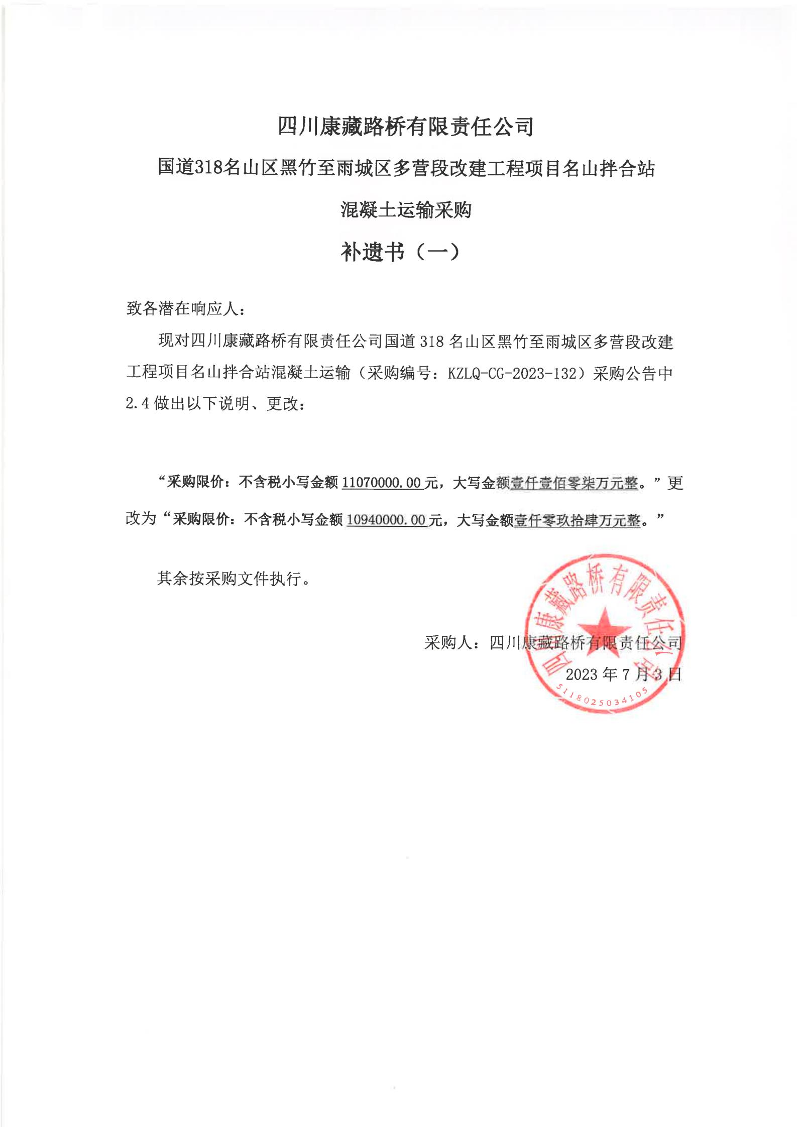 四川康藏路橋有限責(zé)任公司國道318名山區(qū)黑竹至雨城區(qū)多營段改建工程項目名山拌合站混凝土運輸服務(wù)采購補(bǔ)遺書