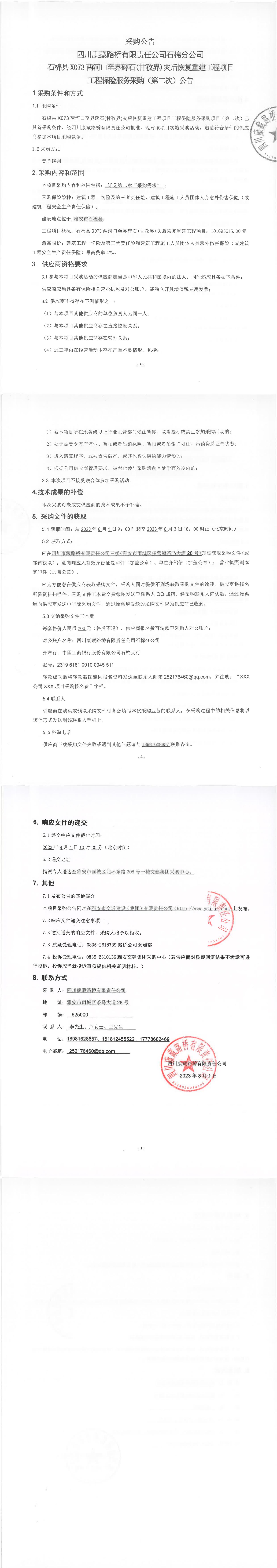 四川康藏路橋有限責(zé)任公司石棉分公司石棉縣X073兩河口至界碑石(甘孜界)災(zāi)后恢復(fù)重建工程項(xiàng)目工程保險(xiǎn)服務(wù)采購(第二次)公告