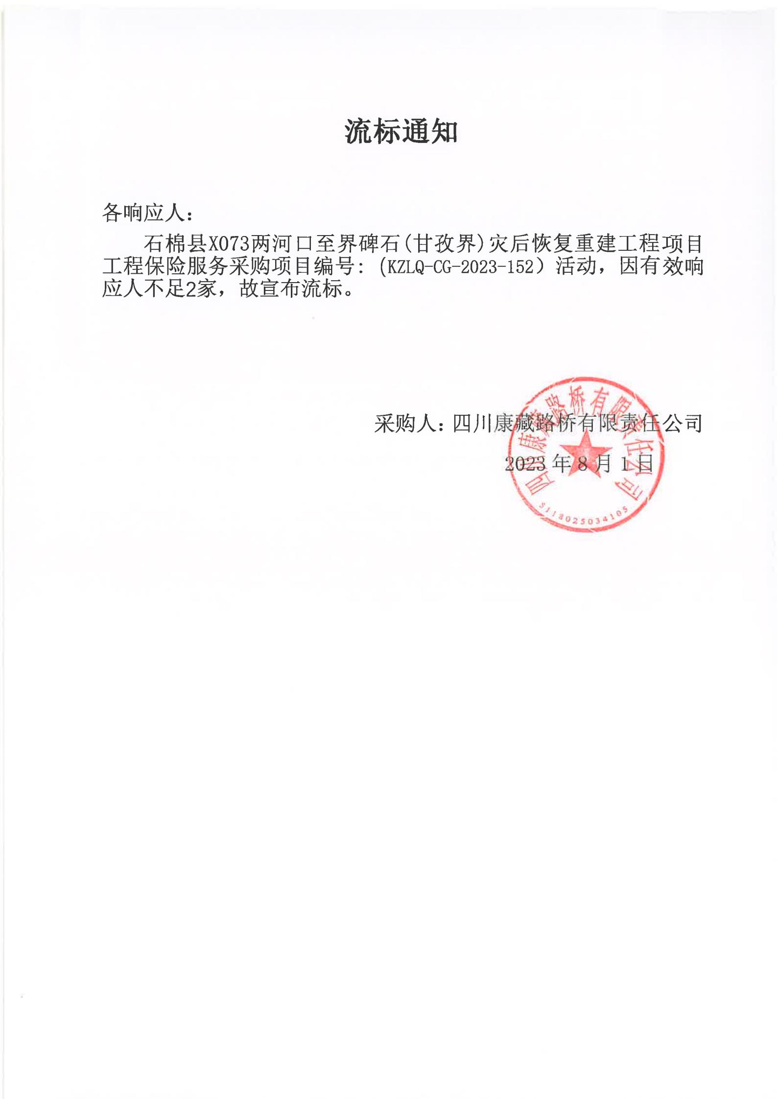 四川康藏路橋有限責任公司石棉分公司石棉縣X073兩河口至界碑石(甘孜界)災(zāi)后恢復(fù)重建工程項目工程保險服務(wù)采購項目流標通知
