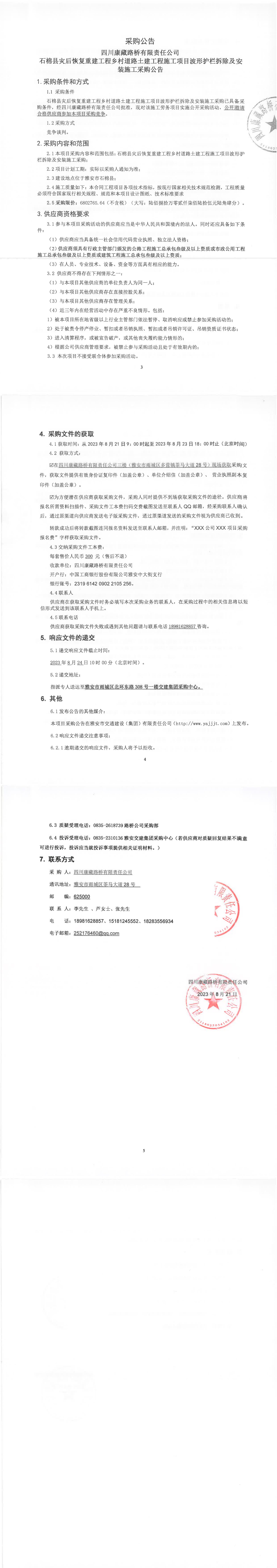 四川康藏路橋有限責(zé)任公司石棉縣災(zāi)后恢復(fù)重建工程鄉(xiāng)村道路土建工程施工項目波形護(hù)欄拆除及安裝施工采購公告