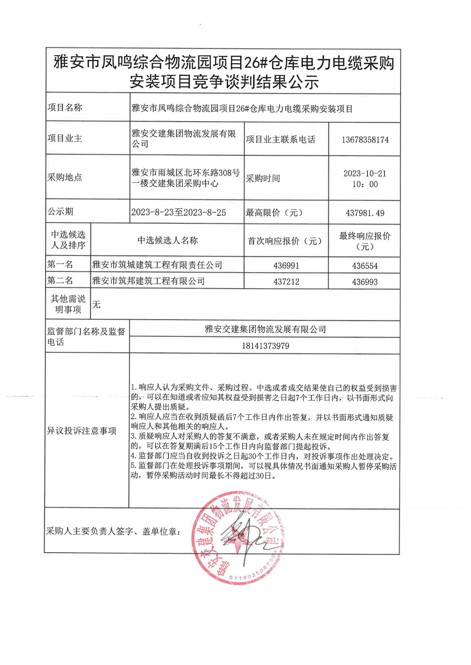 雅安交建集團(tuán)物流發(fā)展有限公司雅安市鳳鳴綜合物流園項(xiàng)目26#倉庫電力電纜采購安裝項(xiàng)目競爭談判結(jié)果公示