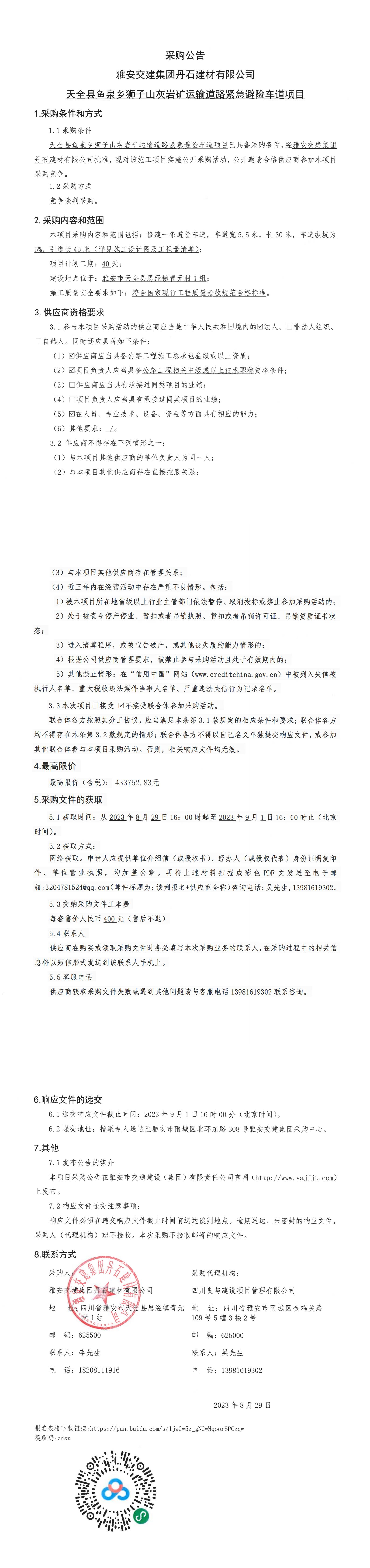 雅安交建集團(tuán)丹石建材有限公司天全縣魚(yú)泉鄉(xiāng)獅子山灰?guī)r礦運(yùn)輸?shù)缆肪o急避險(xiǎn)車道項(xiàng)目采購(gòu)公告