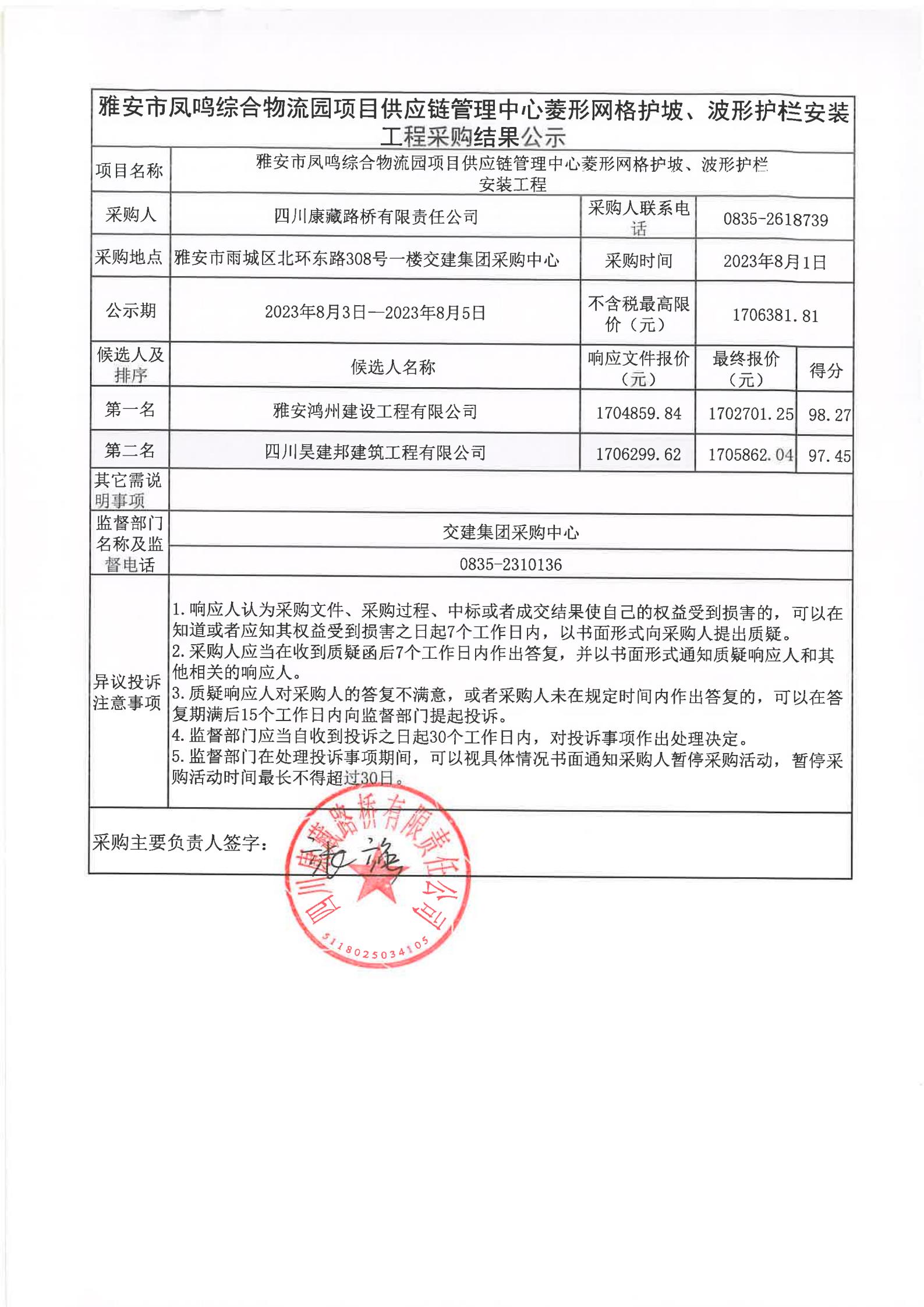 四川康藏路橋有限責任公司雅安市鳳鳴綜合物流園項目供應鏈管理中心菱形網格護坡、波形護欄安裝工程采購結果公示